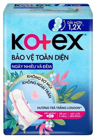 Băng Vệ Sinh Bảo Vệ Toàn Diện Ngày Nhiều Và Đêm Siêu Mỏng Có Cánh Kotex cải tiến với hệ thống bảo vệ chống tràn toàn diện cùng mặt lưới đệm bông ConfortPlus, kết hợp cùng hương trà trắng London dịu nhẹ. Phiên bản 28cm với độ dài hơn 1.2 lần so với phiên bản 23cm, giúp bạn tự tin vận động trong những ngày nhiều và đêm mà không lo tràn băng.