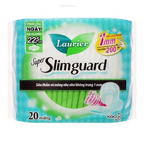 Băng vệ sinh Laurier được sản xuất theo công nghệ tiên tiến nhất từ Nhật Bản. Băng vệ sinh Laurier super Slimguard cánh 22.5cm 20 miếng khả năng siêu thấm hút đến 200 lần. Băng vệ sinh cho cảm giác thoáng nhẹ tựa như không, thoải mái vận động