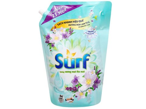 Nước giặt Surft hương sương mai dịu mát gấp 2 lần so với bột giặt. Hương thơm dịu mát bền lâu cho áo quần, mang đến cảm giác tươi mới, sảng khoái mà không cần xài nước xả vải. Tẩy sạch sâu nhưng nhẹ nhàng, ít hao mòn sợi vải, nhẹ nhàng với da tay.