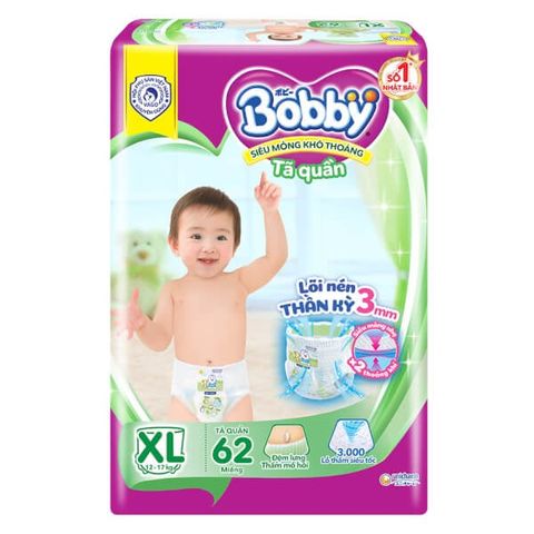 Bỉm tã quần Bobby size XL 62 miếng là sản phẩm bỉm tã dành cho bé từ 12-17kg thuộc thương hiệu Bobby đến từ tập đoàn Unicharm Nhật Bản. Sản phẩm là sự lựa chọn tốt nhất mà mẹ dành cho bé yêu trong những tháng năm đầu đời.